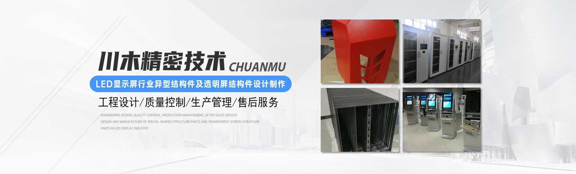 廣東川木精密技術有限公司位于廣東東莞市,公司于2007年成立,2011年3月從深圳遷往東莞,注冊資金500萬,工廠面積6000平方員工50多人,建立了ISO質(zhì)量管理體系,有成套的數(shù)控鈑金設備及噴涂設備,鋁型材數(shù)控加工設備,主要從事設備鈑金外殼及精密鈑金零件設計制作,LED顯示屏行業(yè)異型結構件及透明屏結構件設計制作,從工程設計,質(zhì)量控制,生產(chǎn)管理,售后服務,精益求精滿足客戶需求,致力成為你信賴的結構件供應商。